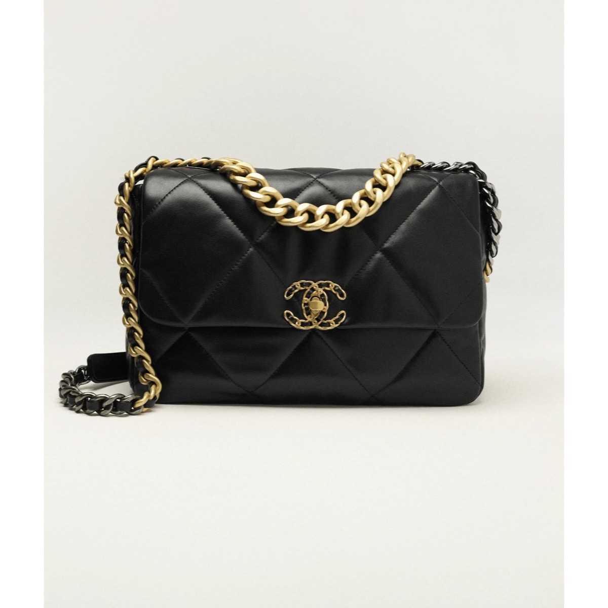 Borsa Chanel 19 in pelle di agnello trapuntata nera con maxi catena goumette dorata e argentata. Chiusura CC intrecciato.