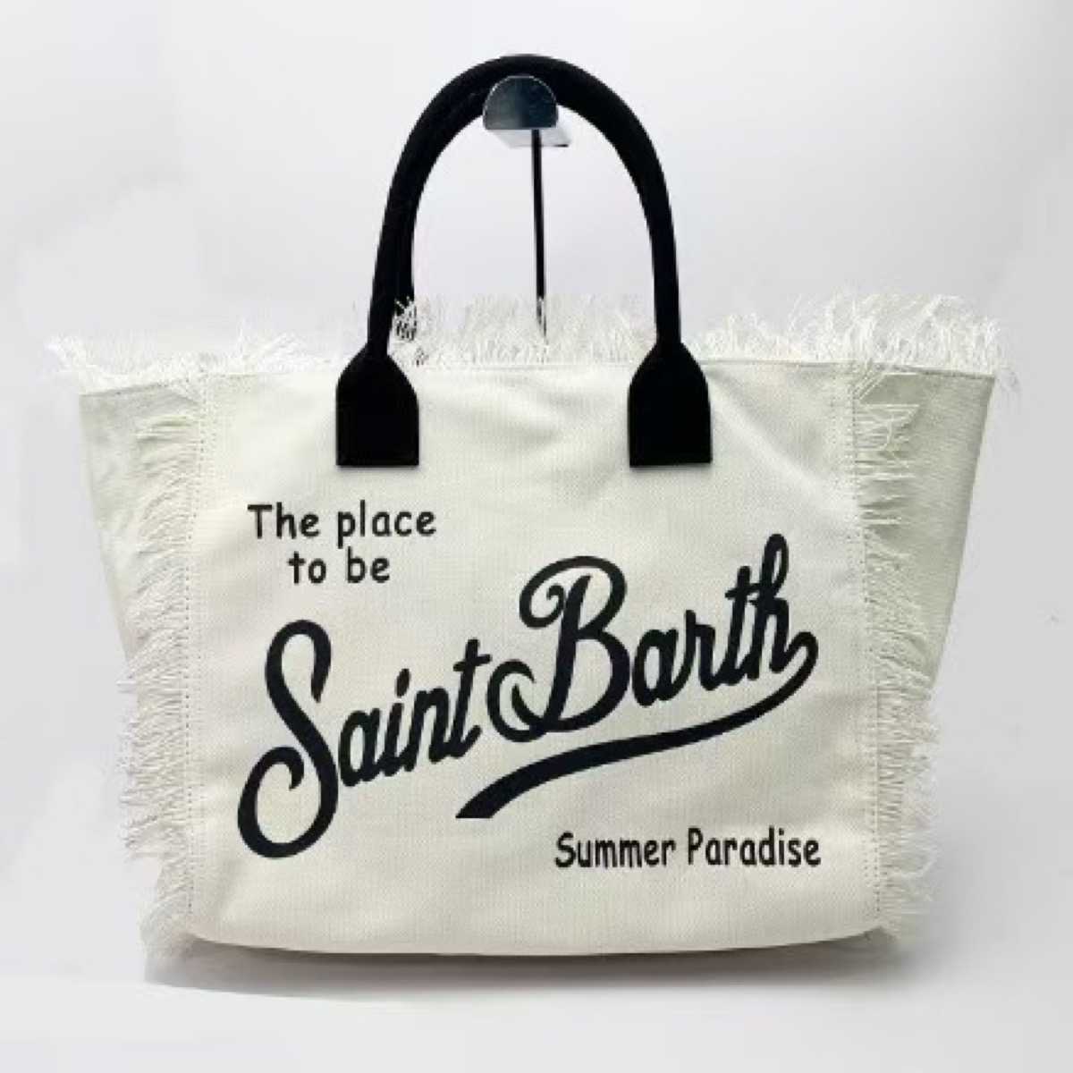 Borsa mare Saint Barth Vanity in tessuto canvas bianco/crema con manici e scritta nera e frange.