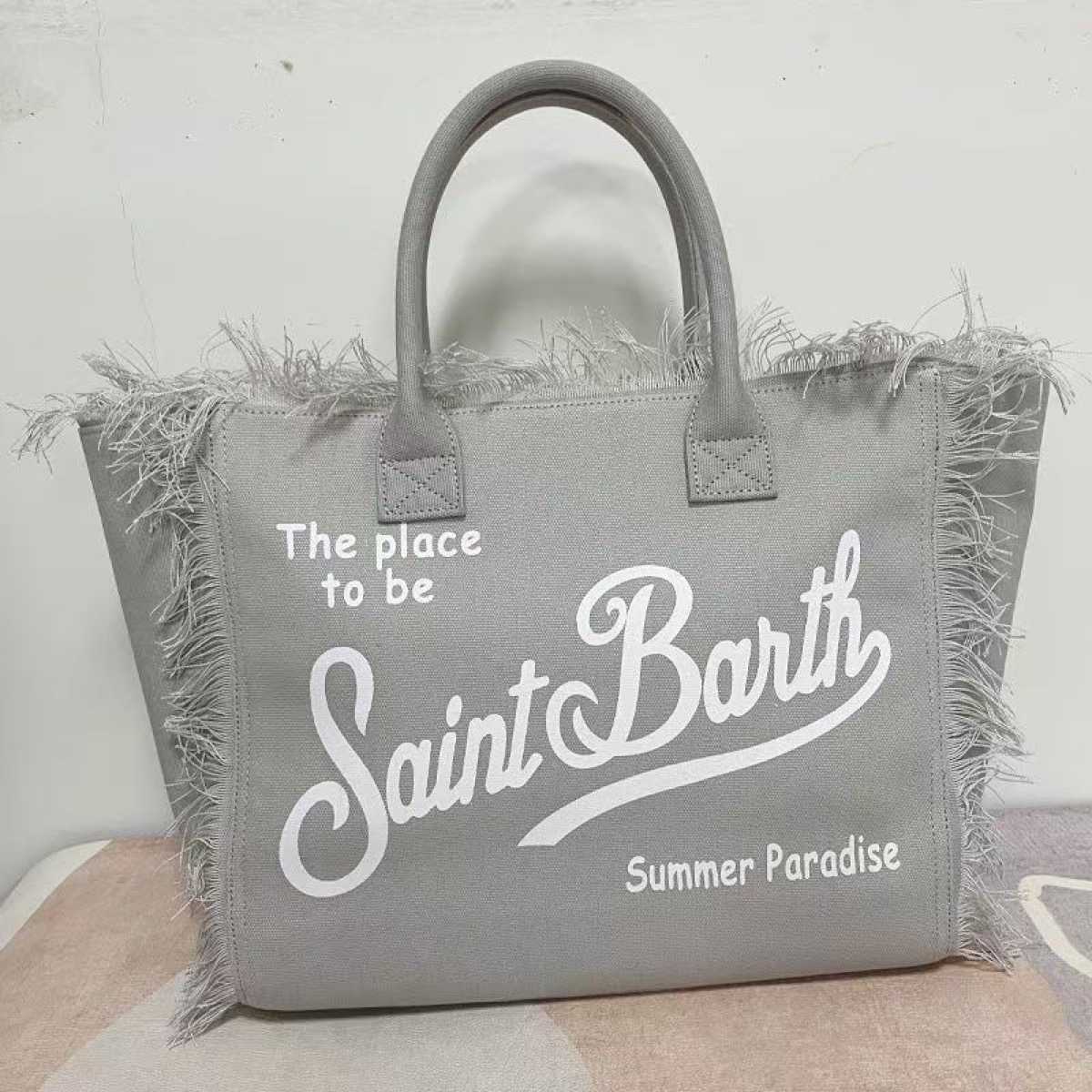 Borsa mare Saint Barth Vanity in tessuto canvas grigio chiaro con ricamo bianco e frange.