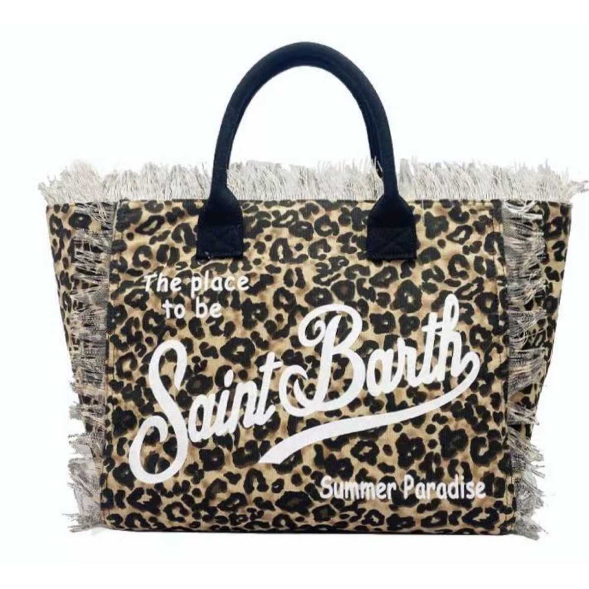 Borsa mare Saint Barth Vanity in tessuto stampa leopardo con ricamo bianco e frange.