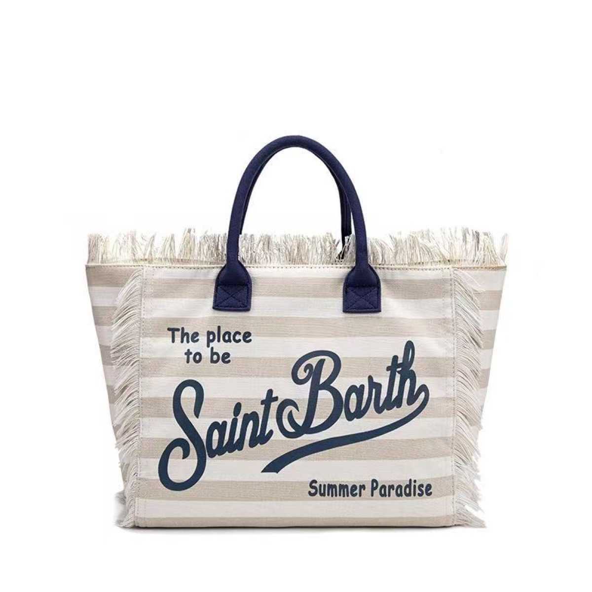 Borsa mare Saint Barth Vanity a righe orizzontali beige e bianche con manici e scritte navy e frange.
