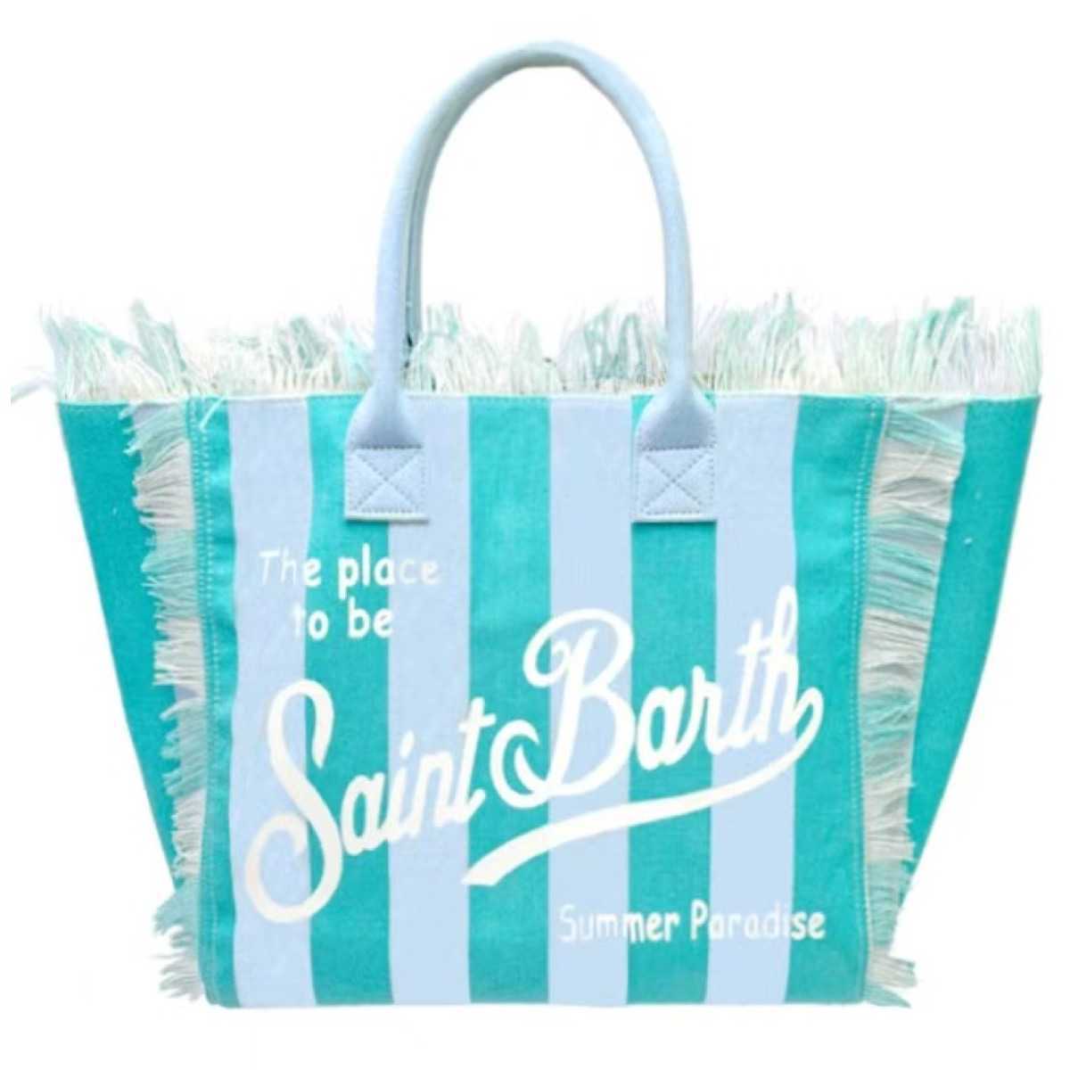 Borsa mare Saint Barth Vanity a righe verticali verde acqua e azzurro con ricamo bianco e frange.