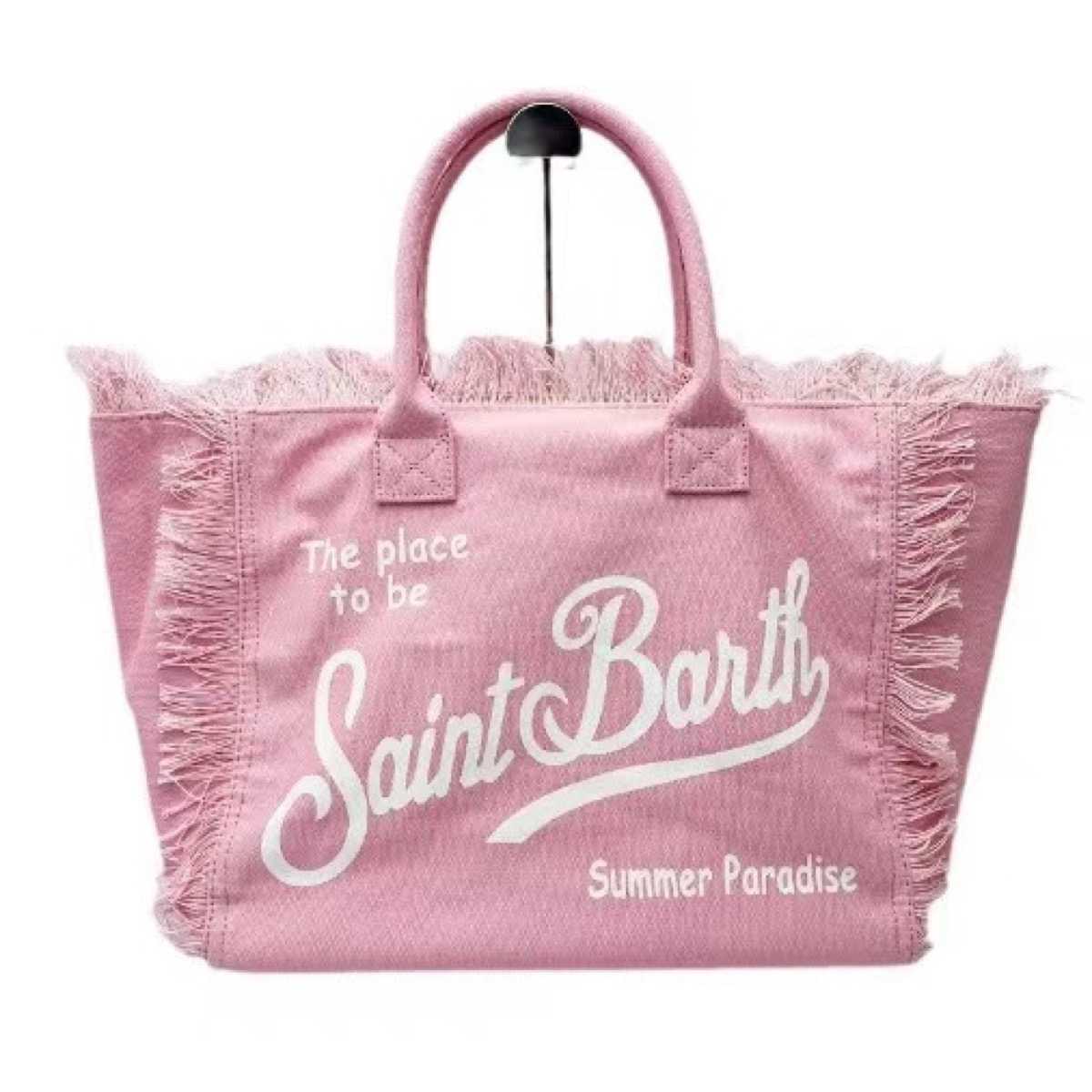 Borsa mare Saint Barth Vanity in tessuto canvas rosa chiaro con ricamo bianco e frange.