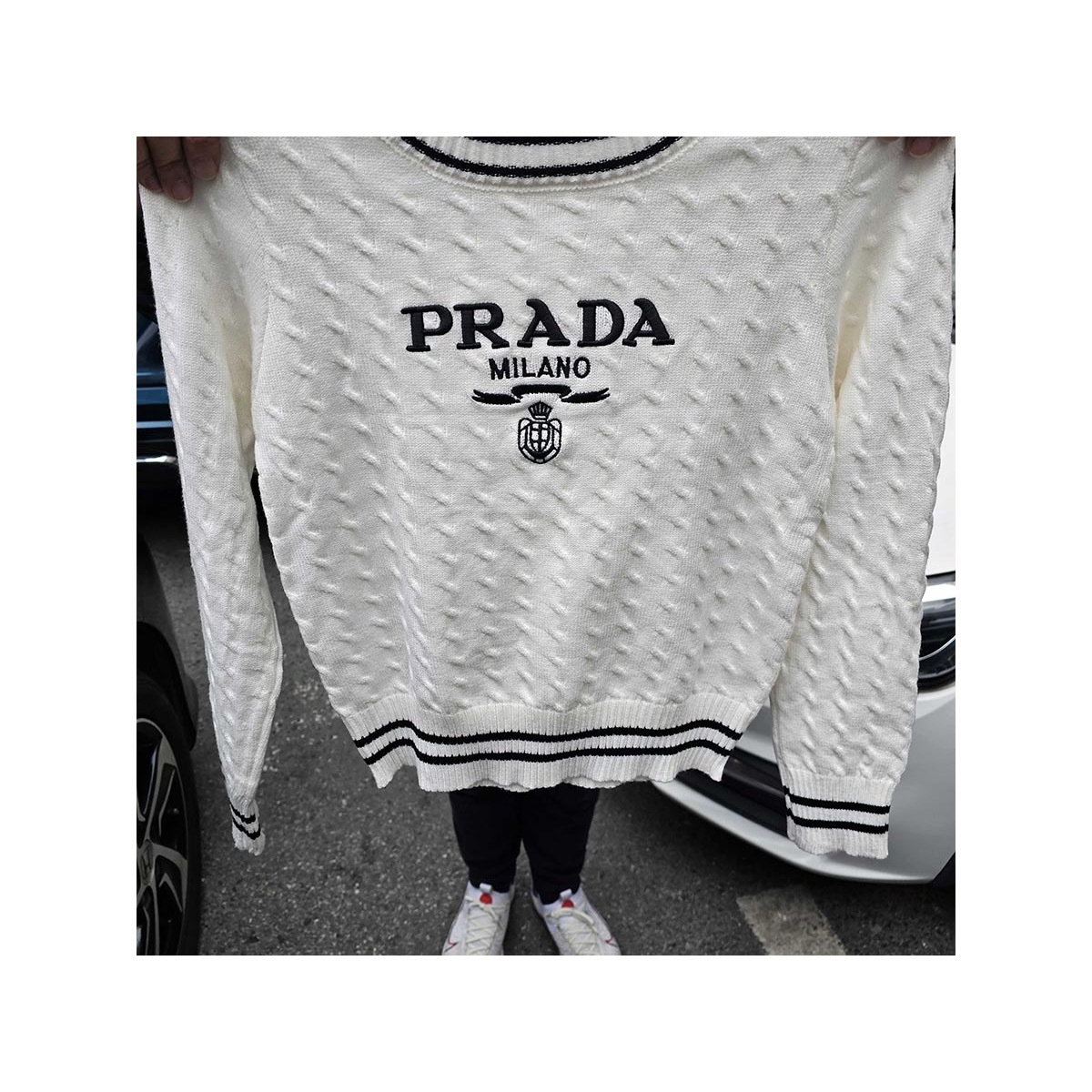 Maglione Prada bianco con scritta PRADA MILANO e motivo trecce.