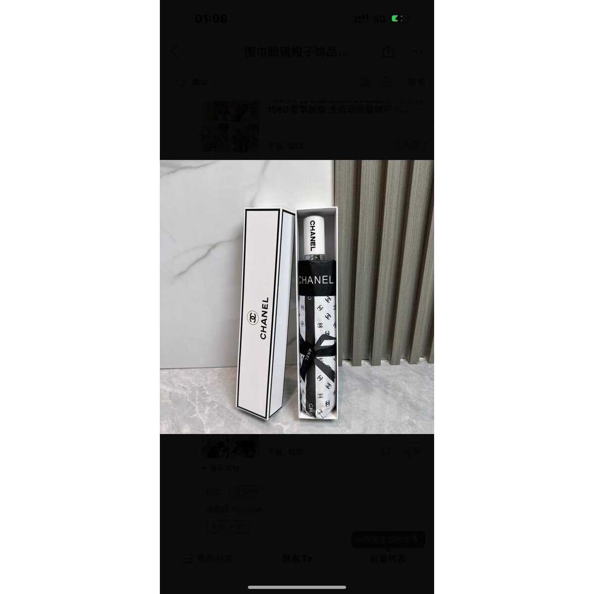 Ombrello Chanel con motivo nastro CC. Disponibile in bianco e nero. Con box.