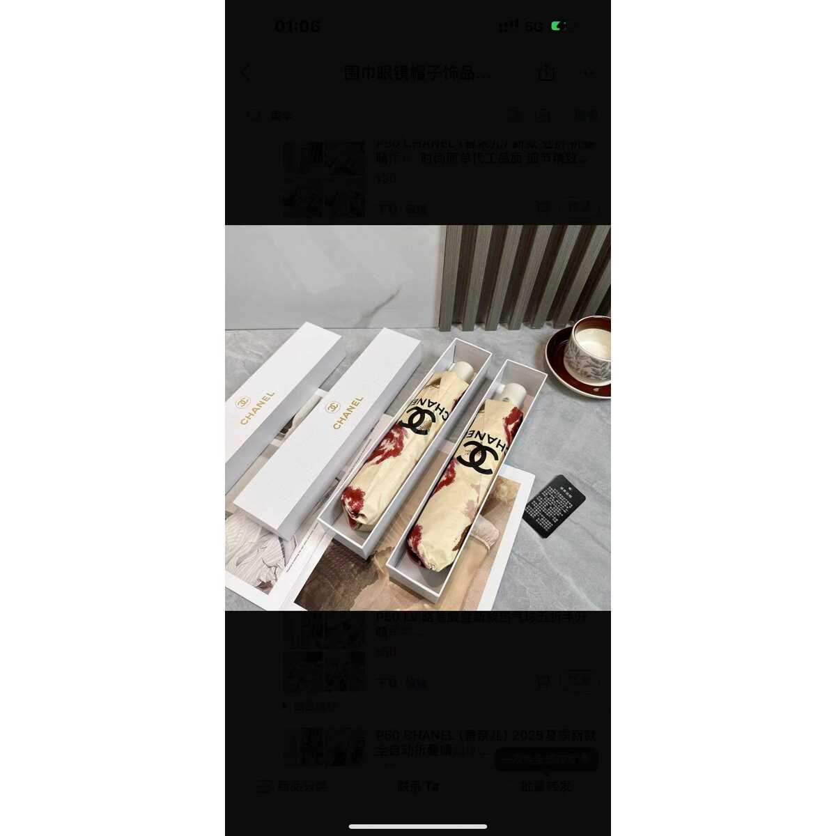 Ombrello Chanel con motivo fiori di ciliegio rosa. Disponibile in bianco, rosa e nero. Con box.