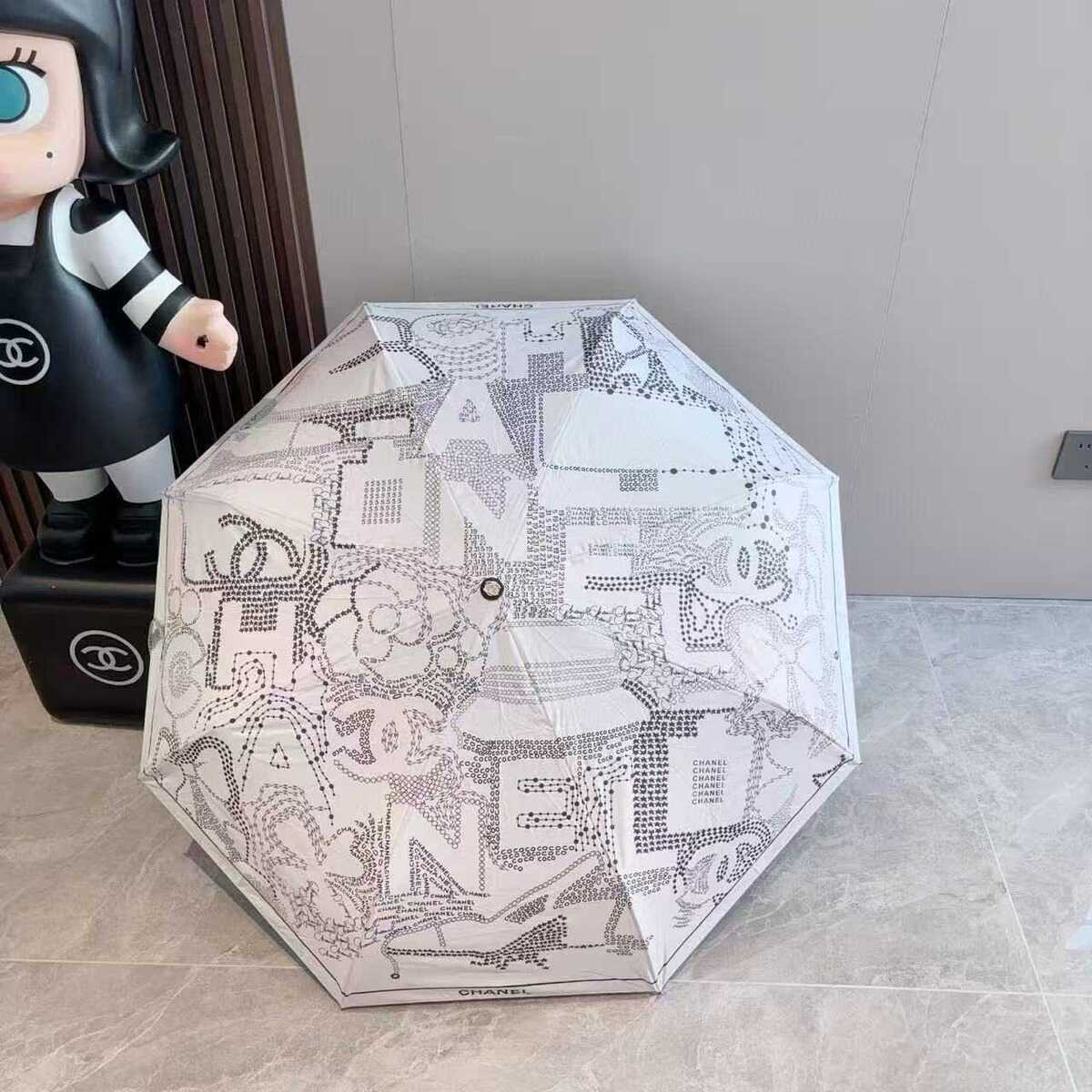 Ombrello Chanel con lettere C-H-A-N-E-L sparse illustrate. Disponibile in bianco e nero.