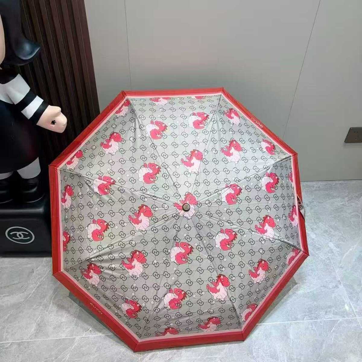 Ombrello Gucci con motivo GG e ciliegie rosse su fondo beige con bordo rosso.