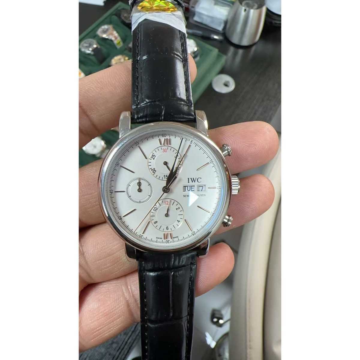 Cronografo IWC Portofino con cassa in acciaio, quadrante bianco con contatori, giorno/data e cinturino in pelle nera.