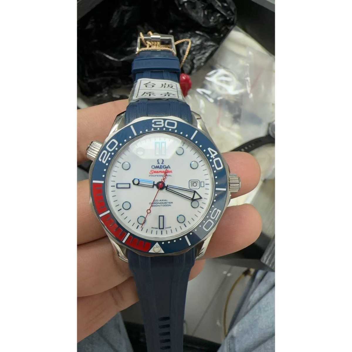 Edizione speciale Omega Seamaster Commander 007 con quadrante bianco, lunetta blu/rossa e cinturino in caucciu blu. Ispirato a James Bond.