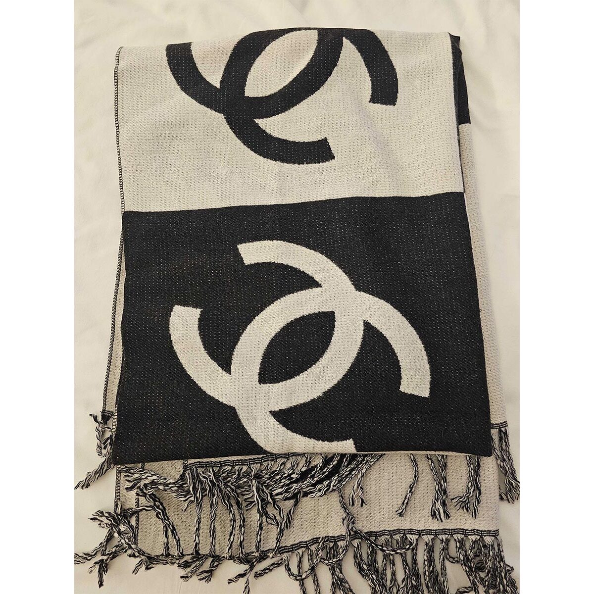Plaid Chanel con grande logo CC nero/bianco con frange.