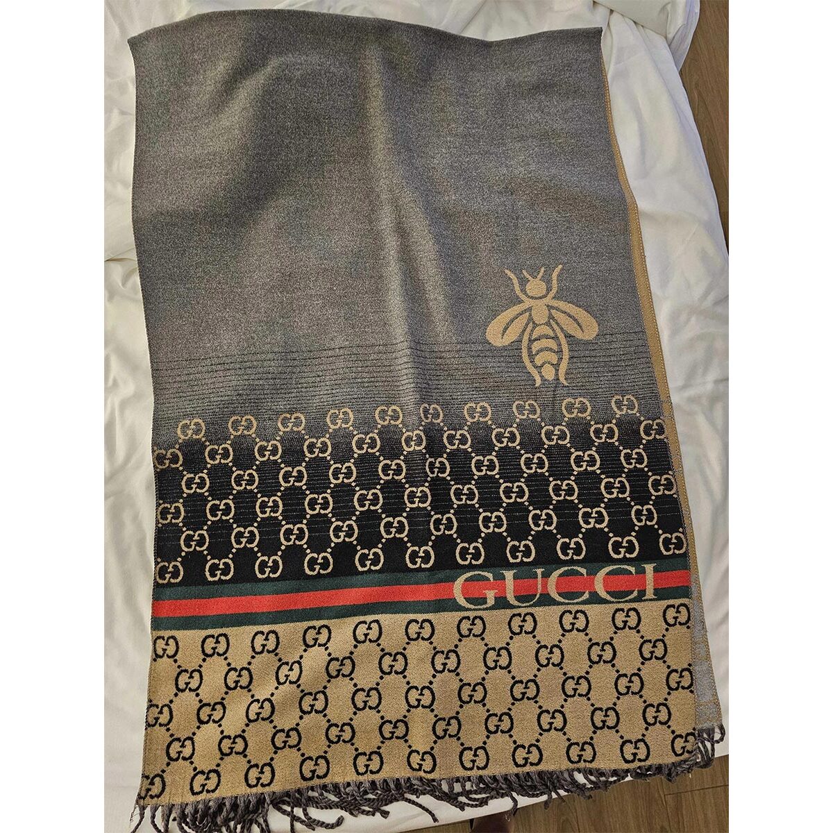 Plaid Gucci con motivo GG, ape e Web grigio/beige/nero con frange.