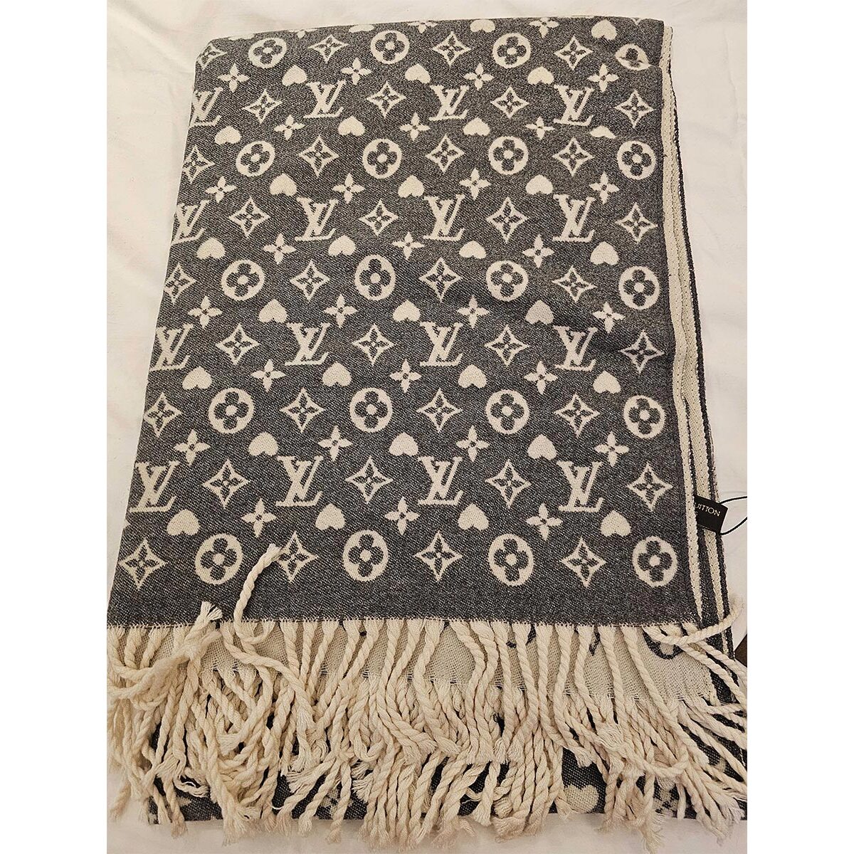 Plaid Louis Vuitton monogram classico con scritta VUITTON marrone/oro con frange.