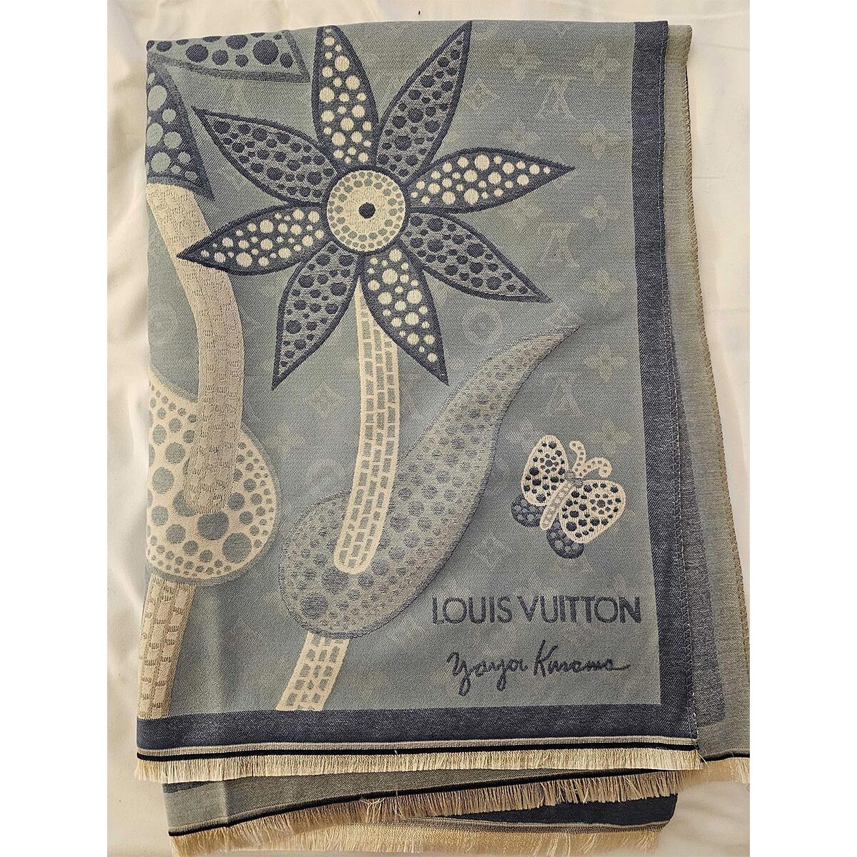 Plaid Louis Vuitton x Yayoi Kusama con fiore e farfalla a pois azzurro/blu con frange. Edizione limitata.