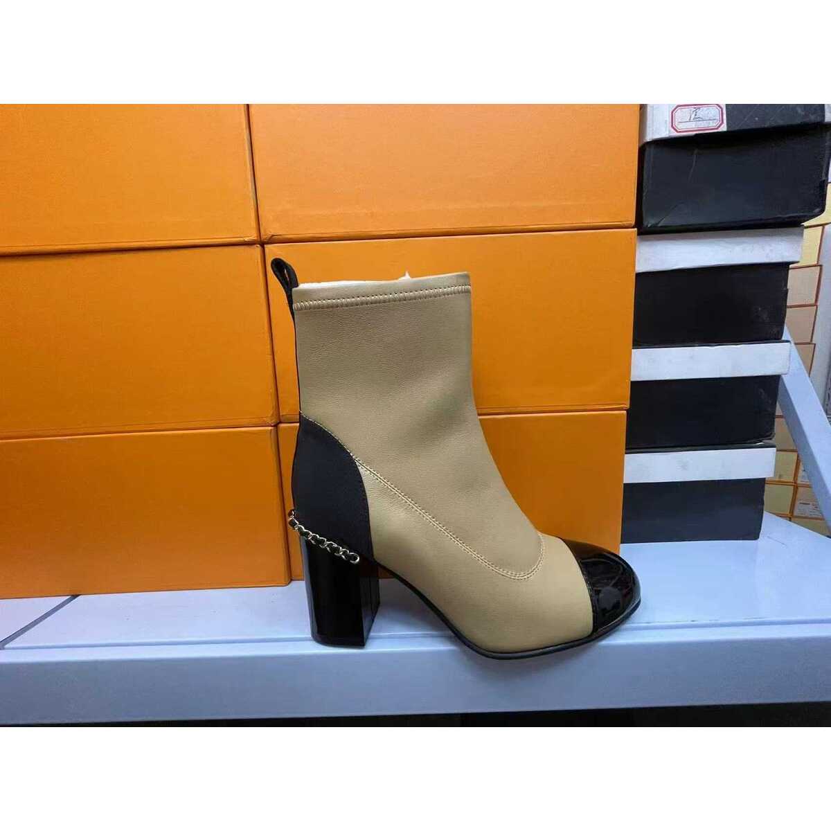 Stivaletto Chanel con punta in vernice, catena decorativa e tacco. Disponibile in beige/nero e nero.