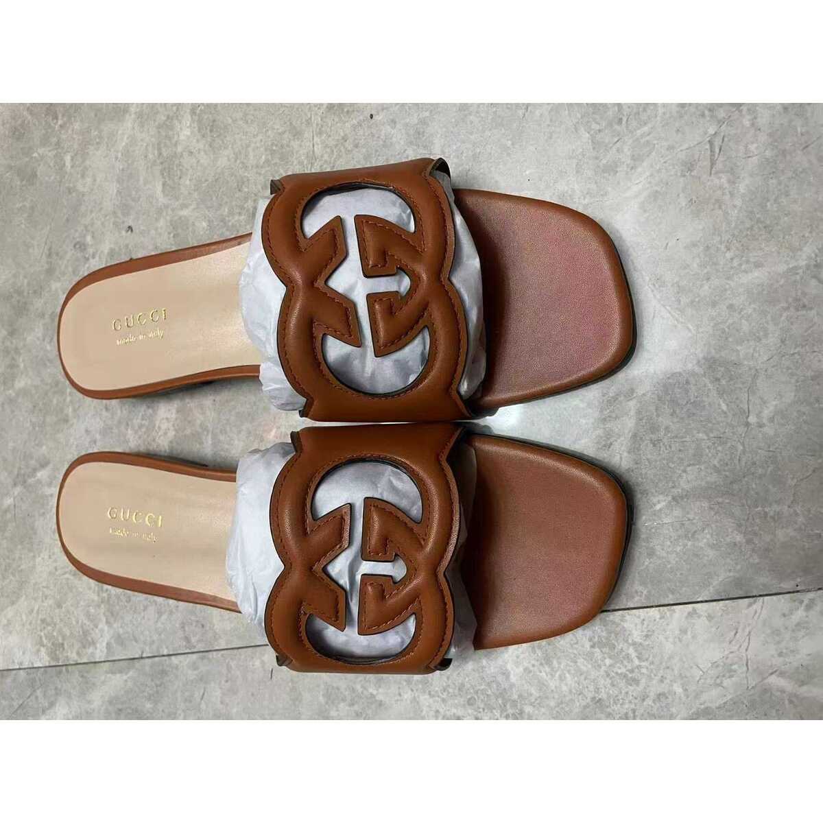 Ciabatta Gucci con logo GG interlocking in rilievo. Disponibile in marrone, bianca e nera.