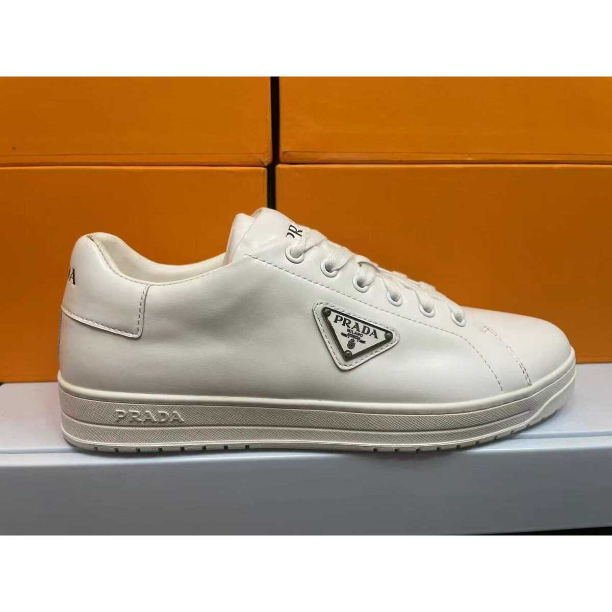 Sneaker Prada con logo triangolo. Disponibile in bianca e nera.