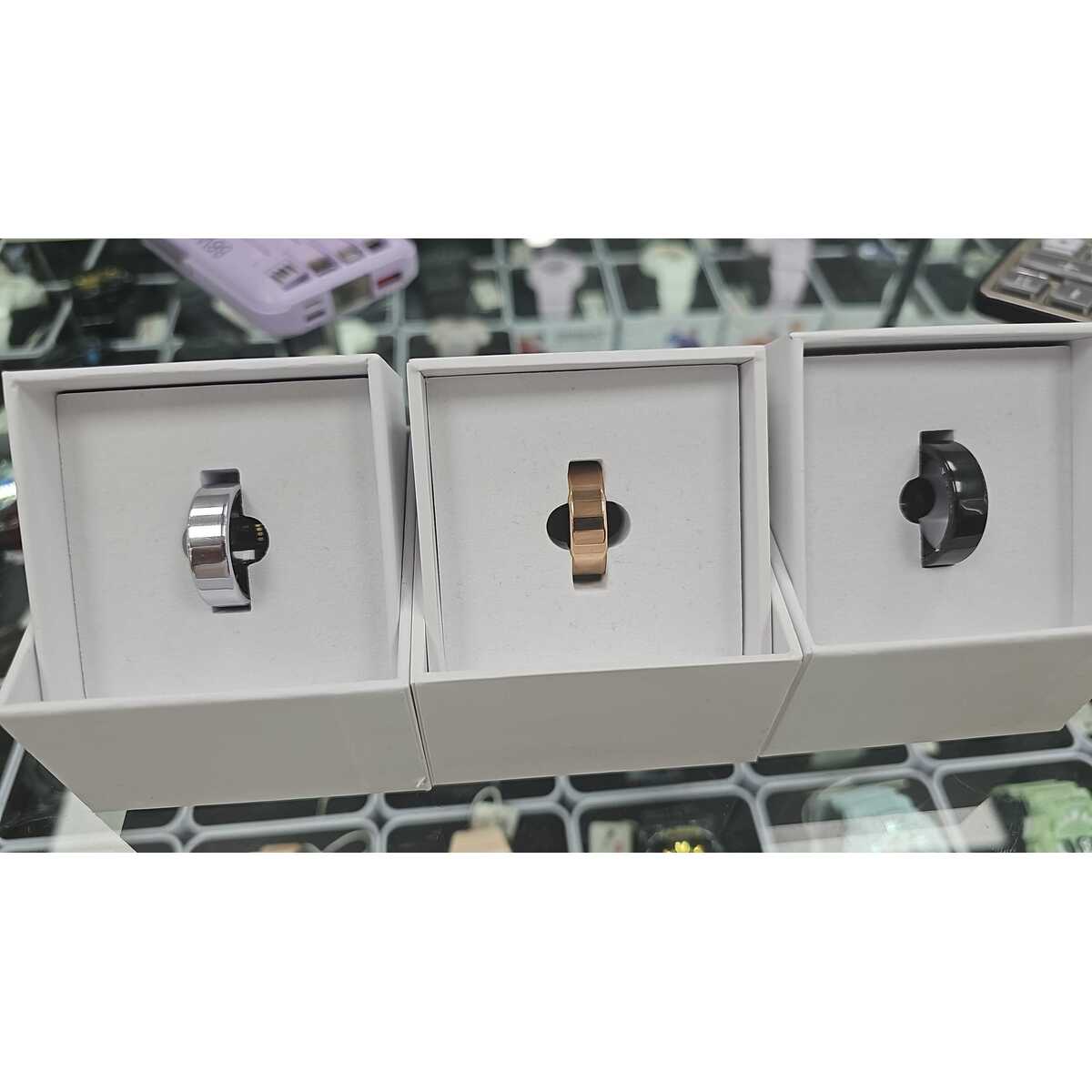 Set di 3 anelli smart in argento, oro rosa e nero. Monitoraggio salute e notifiche. In box bianchi.